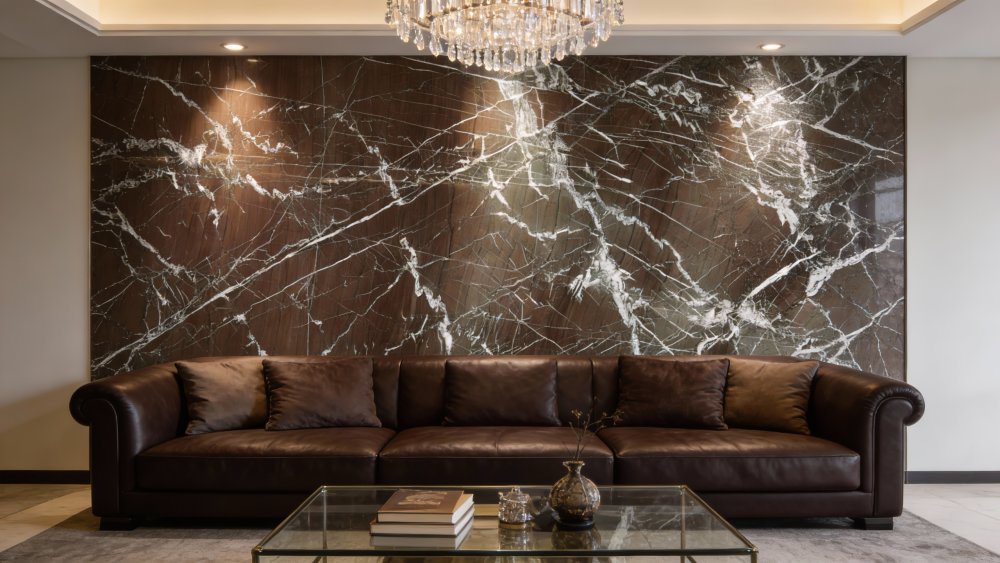 #### 1. 底色基调 石材底色以**温润的深棕色**为核心基调,色泽沉稳内敛,略带一丝灰调的柔和感,既不过于厚重压抑,也不显得单薄轻浮,反而透出自然石材特有的质朴与厚重气息,仿佛沉淀了岁月的质感,为空间奠定了静谧雅致的氛围基底。