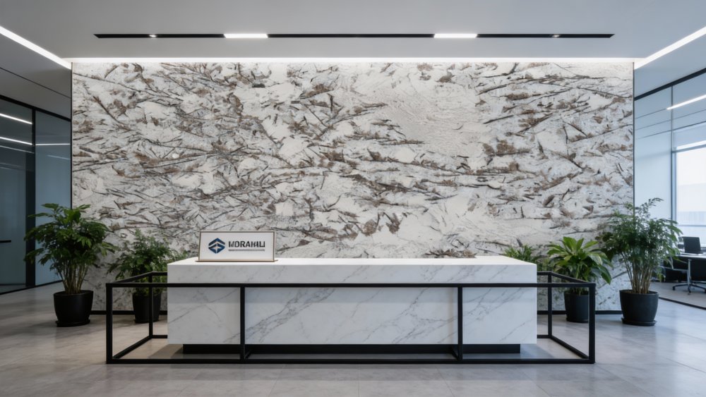 ### 底色基调 这款石材的底色基调为柔和的米白色与浅灰白色交织,整体色调清新淡雅,既保留了自然石材的质朴感,又传递出温润宁静的视觉感受,不会给人过于强烈的视觉冲击,适配性较强。