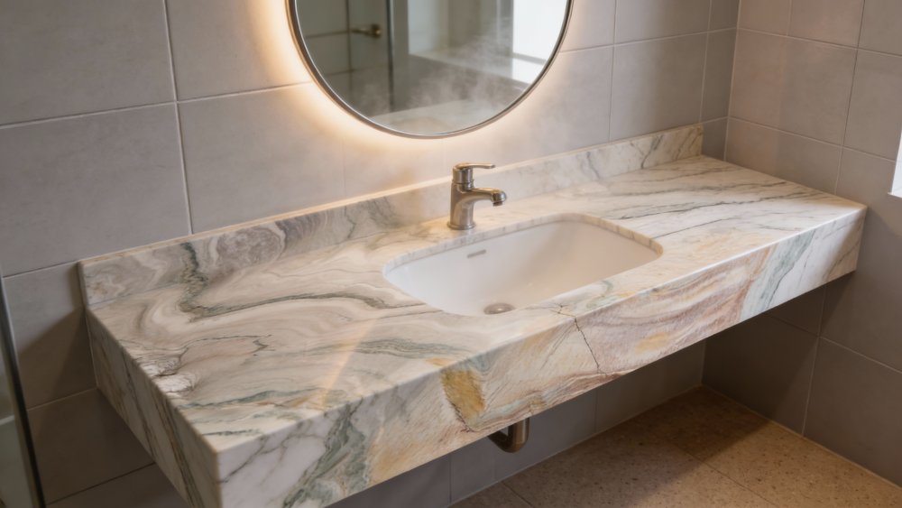 ### 细节质感 表面经抛光处理后呈现**温润细腻的光泽感**,触感顺滑;纹理过渡自然柔和,深浅色交织处无突兀断层,尽显石材的原生细腻;局部可见细微的自然肌理(如底部浅裂纹),未破坏整体质感,反而增添了石材的原生韵味。整体兼具“细腻顺滑的抛光质感”与“自然流动的原生肌理”,视觉与触觉双重温润。