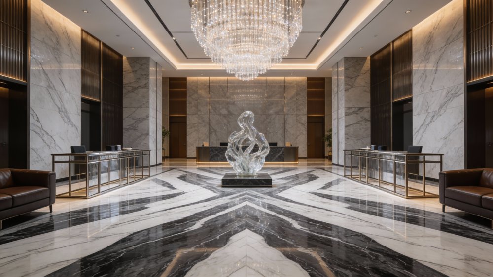 石材表面经精细打磨,呈现**细腻温润的光泽感**,触感应平滑致密。纹理边缘过渡柔和,无生硬切割痕迹,深浅色调衔接处晕染着淡灰色过渡层,增添了质感的丰富度;光线下,浅色系纹理会折射出通透光泽,与深色基底形成明暗对比,凸显立体层次。整体质感既保留了石材的致密厚重,又因细腻的光泽与柔和的纹理边缘,传递出温润雅致的触觉联想。