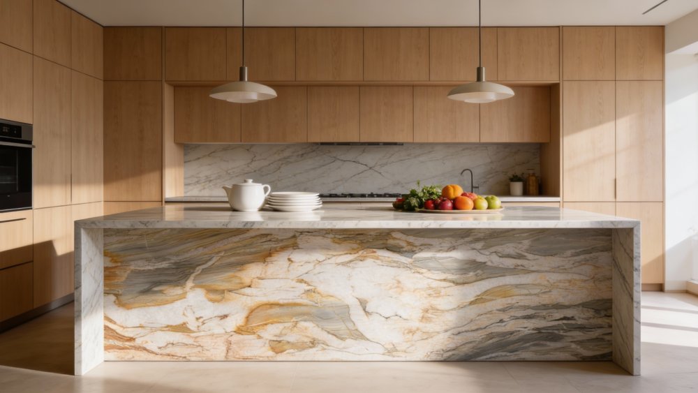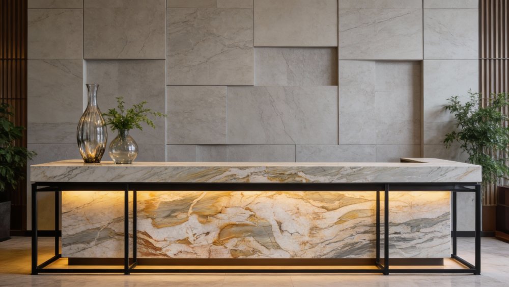 石材表面质感**细腻温润**,触感应是平滑中带着天然石材特有的细微肌理,无明显粗糙感;细节处可见斑驳的暖棕色斑块与深灰色细纹交织,部分区域带有若隐若现的通透感,仿佛沉淀了时光的天然印记。整体质感厚重而不失灵动,兼具质朴的天然气息与雅致的视觉张力,适合营造自然轻奢的空间氛围。