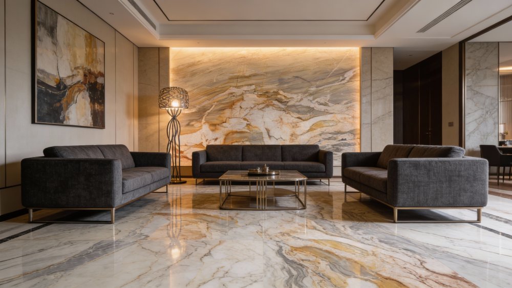 纹理呈现**层叠流动的自然形态**,如同云雾翻涌或水波荡漾般富有动感:深浅不一的灰褐、金棕与浅灰线条交织缠绕,以柔和的曲线勾勒出不规则的色块过渡,层次丰富且衔接自然。纹理无生硬边界,更似天然山水画卷的写意感,兼具飘逸与厚重的双重气质。
