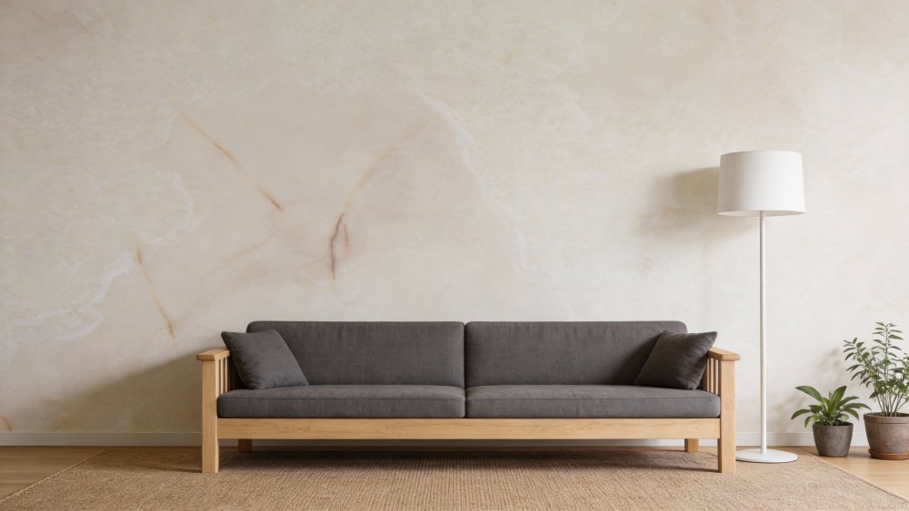 纹理以**浅红褐色纤细线条**与**朦胧云雾状纹理**交织呈现:纤细线条走势随性自然,无刻意规律,或短或长、疏疏落落地分布于基底,似天然脉络般灵动;云雾纹则如轻烟弥散,与细线条相互呼应,层次轻盈不显繁复,整体纹理尽显天然石材的舒展韵律,没有强烈的视觉冲击,却自带舒缓的流动感。