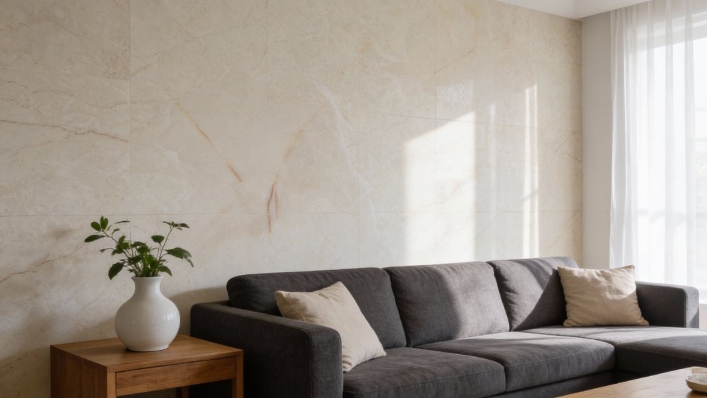 这款石材的底色基调为**柔和奶白色**,色调温润雅致,并非冷硬的纯白,而是融入了自然的暖调质感,如同清晨薄雾般纯净舒适,给人一种宁静、亲和的视觉感受。