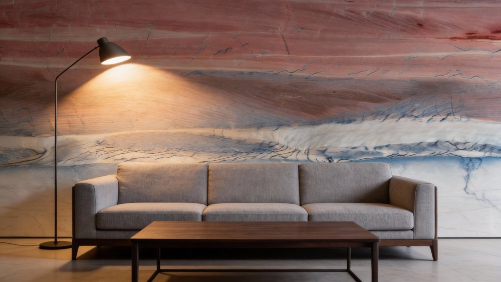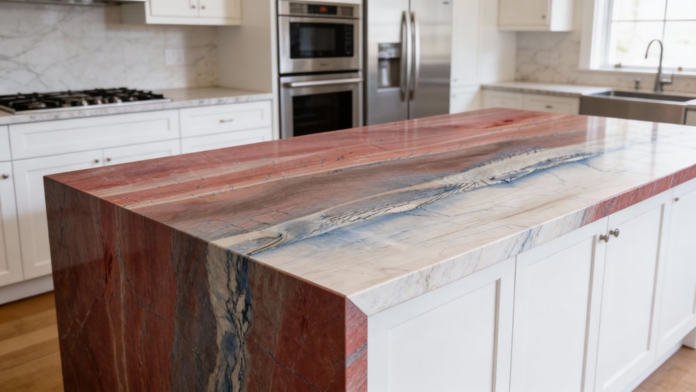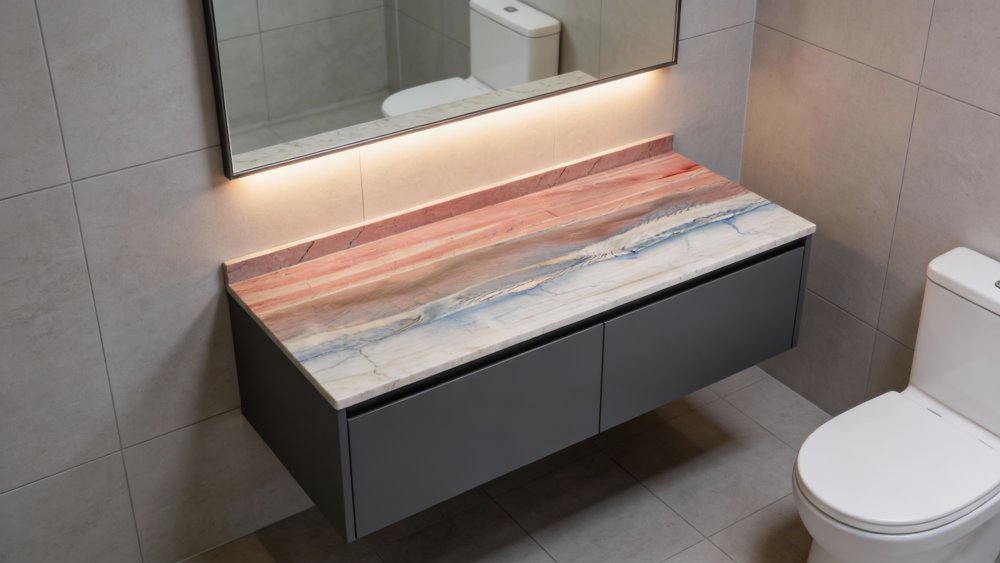 ### 底色基调 石材底色呈现**多层次自然渐变**,从顶部的暖调红褐(略带粉调的地质感),平滑过渡至中部的中性棕灰,再向下延伸为底部的冷调浅灰蓝。暖冷色调交织融合,仿佛地质沉积的时间印记,整体基调丰富却和谐,既保留了自然石材的原始厚重感,又因冷暖过渡增添了柔和层次。