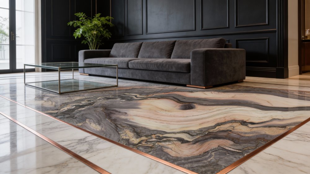细节质感温润雅致,表面带着**自然石材特有的柔和光泽**(非高光亦非哑光),触感细腻平滑却暗含纹理的细微起伏。纹理边缘过渡自然晕染,深灰、褐棕与浅米的色彩无生硬界限,细微处可见矿物颗粒的天然交织,赋予石材厚重的层次感。整体质感厚重而不笨重,温润而不轻薄,仿佛承载着时光的沉淀,尽显天然石材的高端雅致与独特质感。