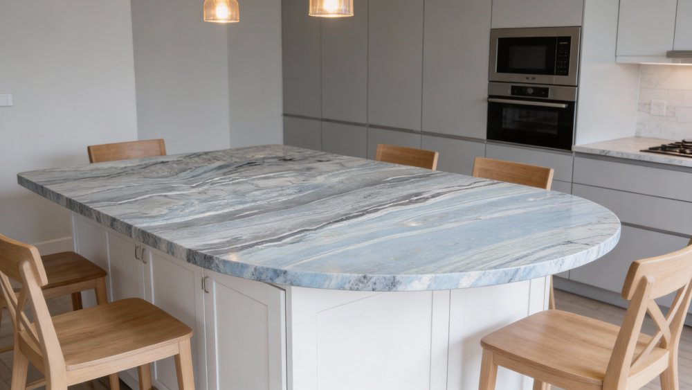 #### **三、细节质感** 石材经抛光处理后,表面呈现**细腻温润的触感与柔和光泽**:浅蓝调区域通透感较强,似含朦胧水汽;深灰脉络处质地致密细腻,与浅色区域形成质感对比;局部点缀着细碎的**浅金色微粒**(如右下角可见的星点),为整体增添了精致的细节层次,既保留了天然石材的原始肌理感,又兼具现代装饰所需的光滑细腻,触摸时平滑无涩感,视觉上则因纹理的深浅变化呈现丰富的光影效果。
