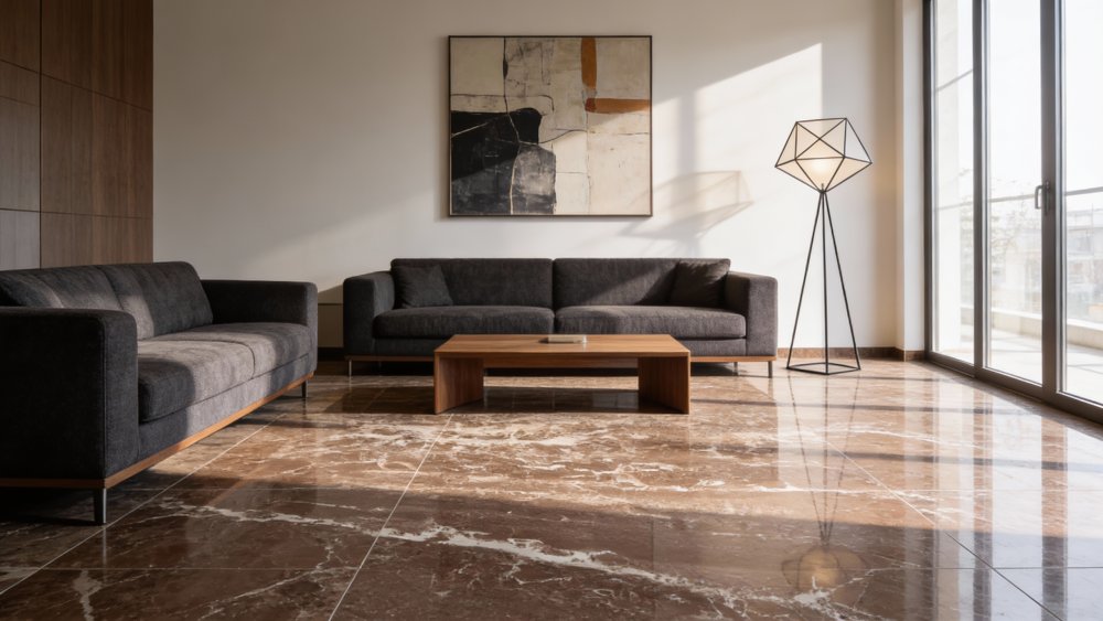 底色以**温润沉稳的深棕色调**为主,介于摩卡棕与深巧克力棕之间,色泽饱满且富有层次——并非单一纯色,深棕基底中隐约渗透着浅棕、灰褐色的自然晕染过渡,整体氛围内敛雅致,既保留了天然石材的厚重感,又通过微妙的色彩变化避免了沉闷,奠定了石材“低调奢华”的视觉基底。
