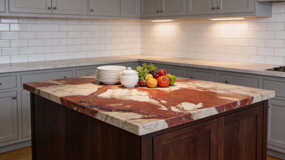 石材表面质感细腻温润,红棕色区域带有细微的天然颗粒感,触感应是平滑中蕴含自然肌理;浅色系纹理部分则相对匀净,边缘过渡柔和无生硬界限。整体光泽度适中,呈现出石材特有的温润哑光质感,每一处纹理的起伏与色彩的融合,都彰显着天然石材的独特性与质感层次,兼具视觉的丰富性与触觉的舒适感。