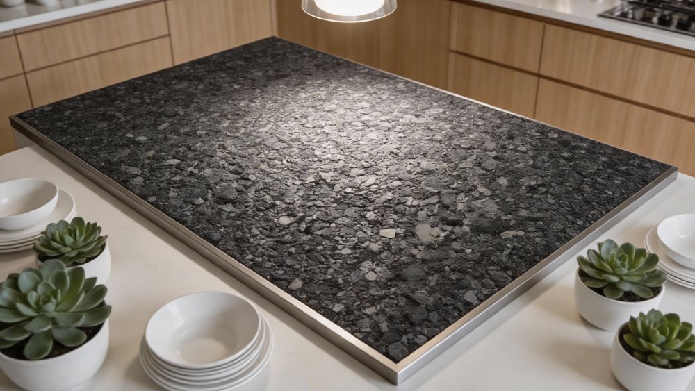 这款石材的底色基调以**深邃的黑色**为核心基底,间杂着炭灰、深灰等不同层次的暗色调,整体呈现出沉稳厚重的视觉质感,如同夜幕下的砾石滩,低调中透着浓郁的自然深邃感,奠定了内敛大气的风格底色。