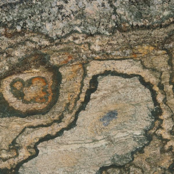 纹理呈现**蜿蜒交错的脉络状结构**:深灰近黑的纤细线条如天然矿脉般勾勒出不规则轮廓,与橙棕色、浅灰色的色块相互缠绕;曲线流畅且粗细变化自然,时而收缩成细密的“血管纹”,时而舒展成开阔的色块镶嵌区,整体似地质运动中形成的层理脉络,兼具流动感与视觉张力。