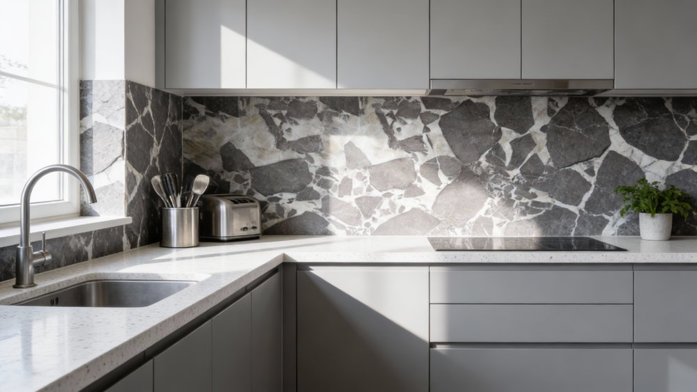 以**温润柔和的米白色**为核心基底,基底并非单一纯白,而是夹杂着浅灰、淡褐的自然晕染与细微肌理过渡,呈现出“暖白中带浅调层次”的质感,弱化了石材的冷硬感,赋予空间温暖舒缓的视觉基调。