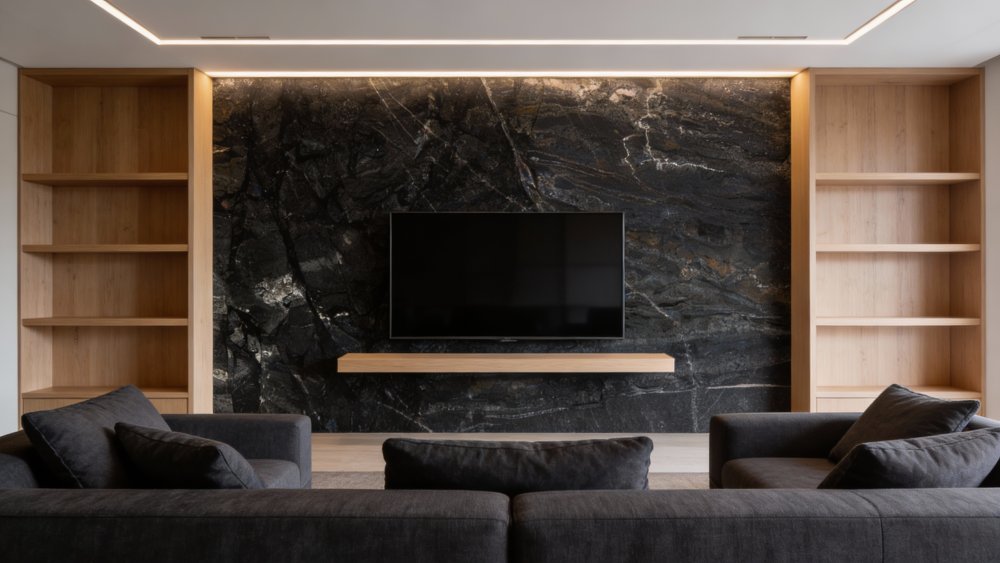 表面经抛光处理后,底色区域细腻温润,泛着柔和的光泽;纹理部分则因矿物成分差异,呈现出轻微的反光对比——浅色脉络(银灰、浅白调)如碎钻般隐于黑底,触感应是光滑中带着细微肌理变化,既保留了石材的天然质感,又兼具精致的现代装饰性。近距离观察时,深浅纹理交织的层次丰富,让整体不显单调,每一处细节都藏着自然的随机之美。