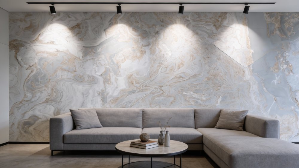 石材底色以**纯净柔和的浅灰色与奶白色**为主调,二者自然交织形成清新基底;同时点缀着**浅香槟色与淡金色**的暖调纹理,整体基调达成“冷调清新+暖调温润”的平衡——既保留了浅色系石材的雅致通透,又因暖调纹理的融入避免了冷色的疏离感,营造出“清新而不冰冷,温馨而不艳俗”的视觉氛围。