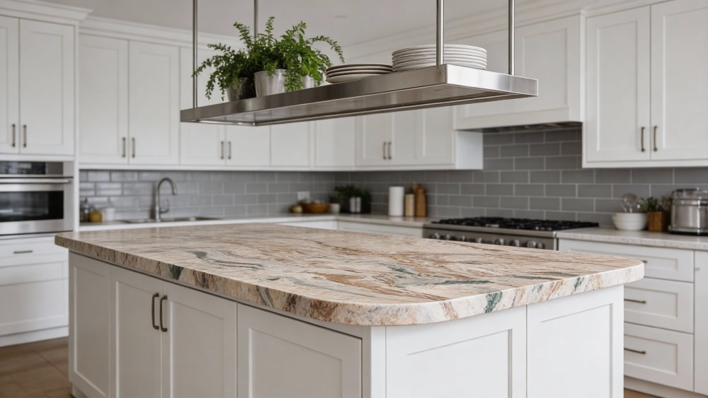 表面经抛光处理后**光滑细腻**,触感应温润顺滑,视觉上呈现柔和的光泽(非刺眼高光);纹理间的矿物颗粒隐约可见,灰绿色小点与棕红色脉络形成材质细节的对比,既保留了天然石材的质朴肌理,又因抛光工艺增添了精致细腻的质感,整体兼具“自然野趣”与“细腻温润”的双重特质。