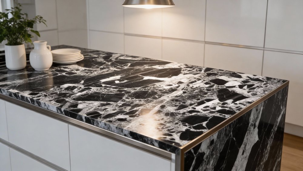 经精细抛光处理后,石材表面呈现出**温润细腻的光泽感**:墨黑基底部分触感平滑,隐约可见内部细小的矿物颗粒闪烁,低调中透着精致;白色纹理部分略带通透感,边缘处的结晶肌理清晰可辨,部分区域带有轻微的结晶光泽,与墨黑部分的顺滑形成微妙反差。整体既保留了天然石材的原始肌理张力,又兼具现代工艺打磨后的精致顺滑,触之细腻、观之富有层次,尽显高端石材的质感与格调。