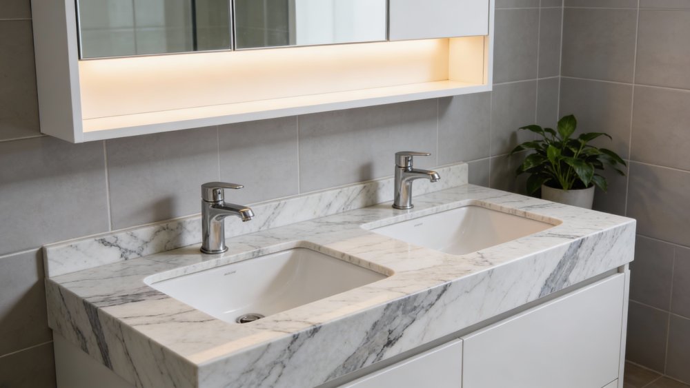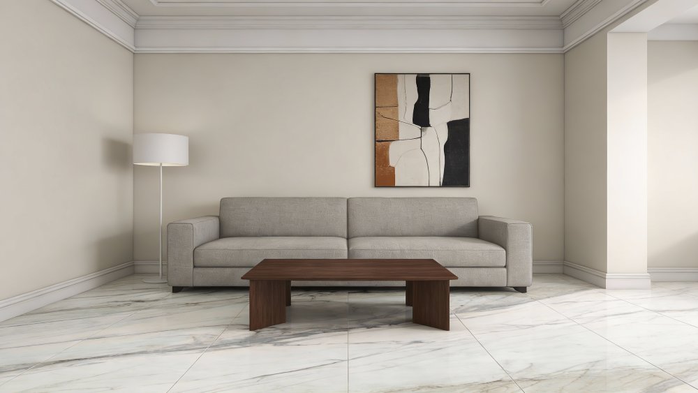 细节处质感细腻高级:抛光后的表面光滑莹润,触感应是温润顺滑;纹理过渡自然柔和,深色纹路与底色间无生硬边界,似墨色在宣纸上晕染开来;局部通透感强,隐约可见石材内部的肌理层次,既有天然石材的质朴厚重,又兼具细腻雅致的光泽感,视觉上精致而不浮夸,尽显轻奢格调。