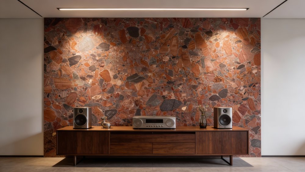以暖调红棕色为核心基底,融合深褐、黑灰等暗色系斑驳色块,整体呈现出沉稳而复古的暖棕色调。既保留了天然石材的原始厚重感,又因暖红色调的柔和渗透,避免了冷硬感,增添了一丝温润内敛的气息。