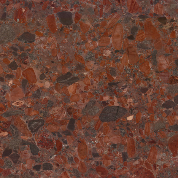 属于**不规则斑驳交错纹理**,由大小不一、形状各异的红棕、深褐、黑灰等矿物颗粒自然散布而成。无刻意规律的排布方式,形成了错落有致的碎片化视觉效果——如同天然矿石在地质作用下随机聚合,红棕主色块与深褐、黑灰色块相互交织,既粗犷又富有层次感,展现出自然石材的原始张力。