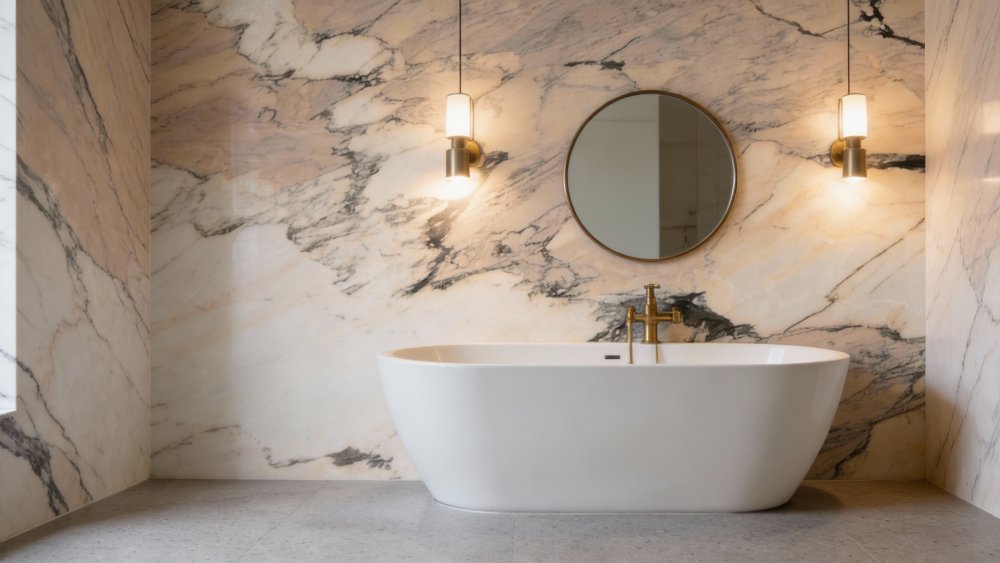 这款石材的底色以柔和暖调为主,融合了米白、淡粉与浅米色的自然渐变,整体呈现出温润雅致的浅暖色系。没有强烈的色彩冲突,如同清晨的柔光般舒缓,给人一种舒适、静谧的视觉感受,既保留了天然石材的质朴感,又兼具优雅的气质。