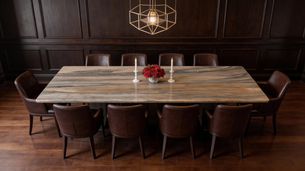### **三、细节质感:细腻厚重,质朴精致** 表面质感**细腻温润且不失厚重**,呈现天然石材特有的哑光/半哑光质感,触感应平滑却带有温润的肌理温度。纹理边缘过渡自然柔和,无生硬切割感;细微处可见天然石材的轻微色差与肌理变化(如局部浅淡的色点或纹理起伏),既保留了自然质朴的原生感,又兼具细腻的精致度。整体质感沉稳大气,层次丰富,彰显天然石材的内敛高级感。