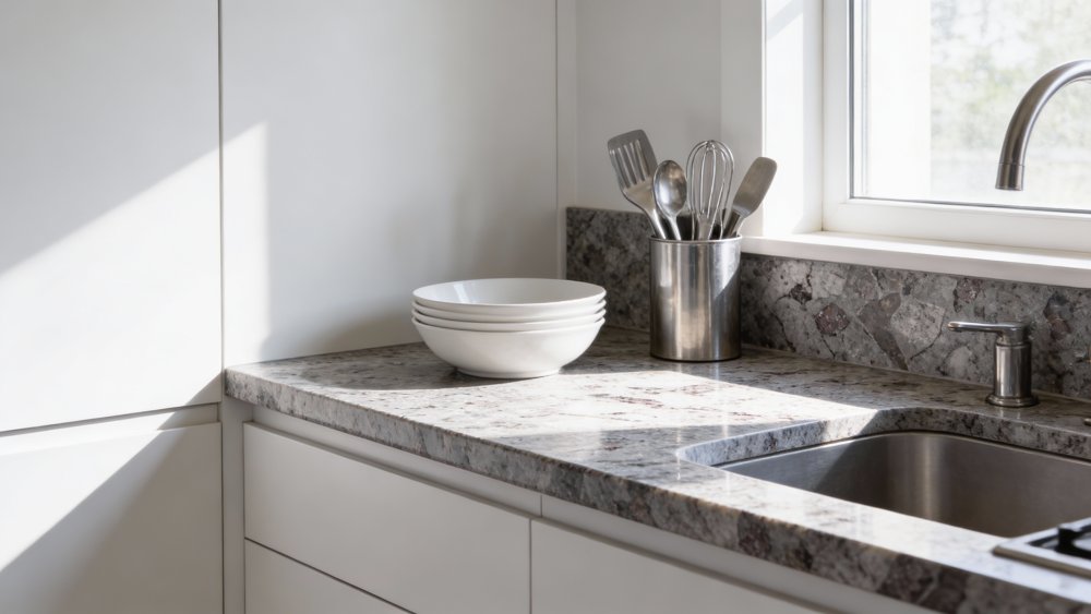 ### 细节质感 表面质感细腻中透着天然石材的质朴粗糙感:底色区域触感应是温润哑光的,无强烈反光;深灰色纹理边缘清晰却不尖锐,略带肌理起伏;粉紫色斑点则带有轻微颗粒感或微弱凸起,整体无刻意打磨的光滑感,保留了原石的厚重真实感,每一处纹理分布都独一无二,彰显天然石材的不可复制性。
