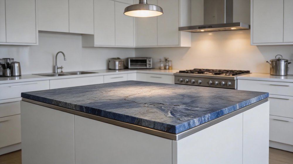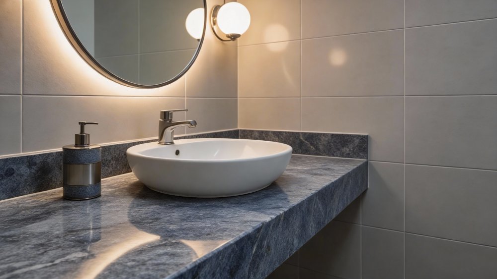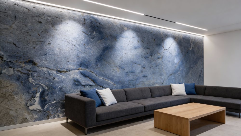 ### 底色基调 底色以深邃的蓝灰色为主基调,整体色调沉稳内敛,其间夹杂着浅灰与淡蓝的斑驳晕染,形成层次丰富的基底氛围。深色基底中隐约透出的浅色调块,如同湖面涟漪般柔和散开,既平衡了整体的厚重感,又增添了视觉上的呼吸感,奠定了石材沉稳而不失灵动的基调。