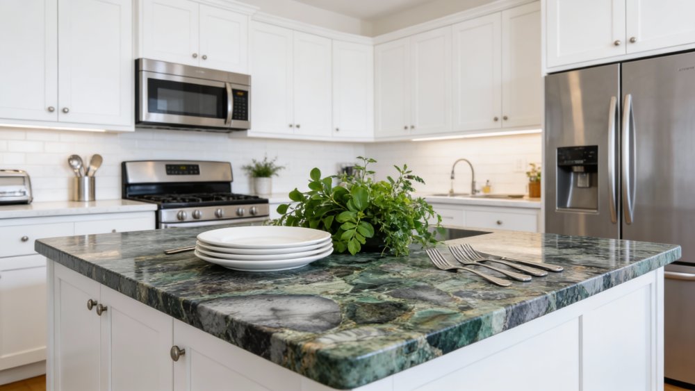 ### 细节质感 经抛光处理后,石材表面呈现细腻温润的光泽。深灰色区域带有轻微的天然颗粒感,触感应是致密坚硬;墨绿色部分因矿物成分差异略显透亮,光泽度略高于灰色区域;灰白色结晶区则质感相对通透。整体兼具天然石材的粗犷颗粒肌理与抛光工艺带来的顺滑细腻,不同纹理区域的光泽与触感差异,丰富了视觉与触觉的层次变化。