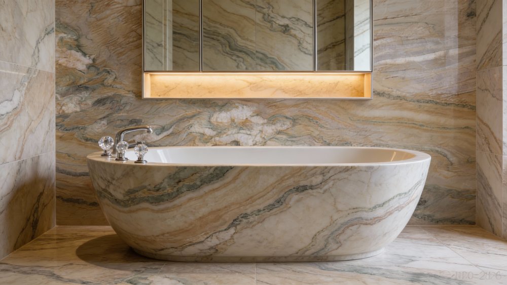 ### 一、底色基调 这款石材的底色基调以暖色系为主,融合了米黄、浅棕与淡褐等柔和色调,间杂着浅灰与微绿的冷调过渡,整体呈现出温暖而层次丰富的基底。如同被阳光浸润的大地,暖调底色中隐约透出的冷色肌理,既平衡了视觉温度,又赋予基底自然的呼吸感,给人舒适、沉静的初始印象。