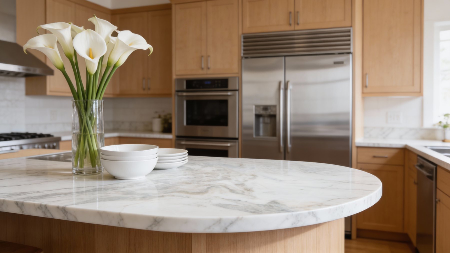 这款石材的底色基调为柔和雅致的浅灰白色,整体呈现出干净通透的视觉效果,如同清晨薄雾般温润内敛,没有强烈的色彩冲击,却自带静谧高级的氛围,既保留了白色系的清爽感,又因淡淡的灰调注入了一丝沉稳质感。