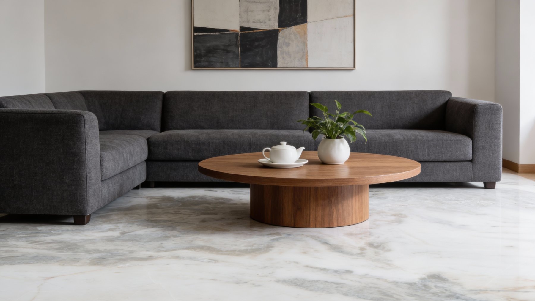 在细节质感上,石材表面细腻光滑,带有柔和的温润光泽(非刺眼高光),触感应是顺滑细腻的。纹理边缘过渡自然,灰调纹理从深灰到浅灰的渐变层次丰富,部分区域可见近乎透明的淡色纹理与底色交融,仿佛天然石材在形成过程中留下的“呼吸感”,既保留了天然石材的质朴肌理,又因细腻的表面处理尽显高级精致感。