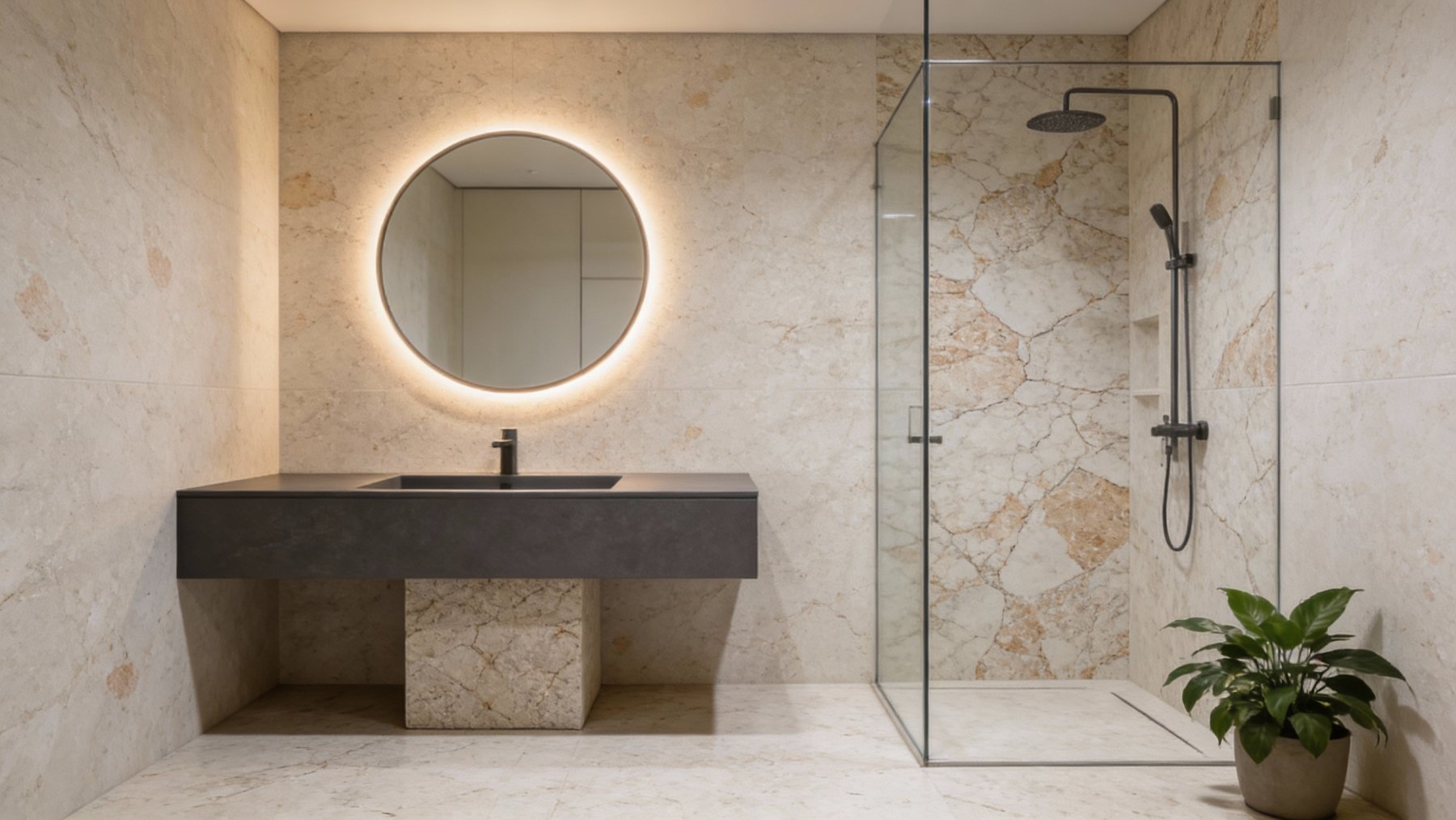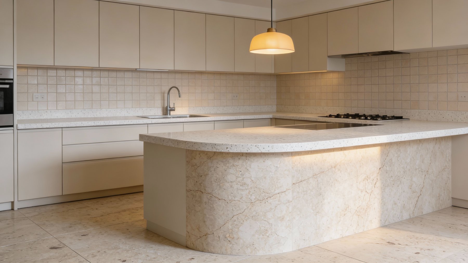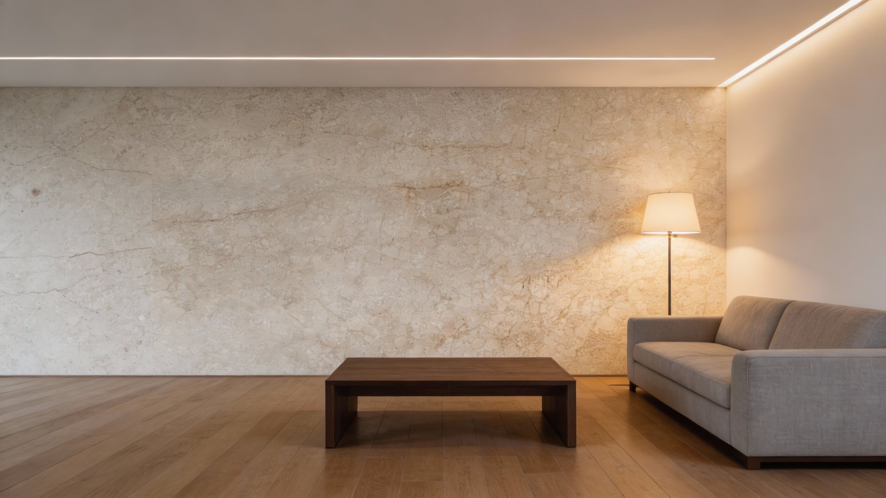 表面质感**细腻温润**,推测为哑光或半哑光质地(视觉上无强烈反光)。纹理处的深浅过渡自然,细微的色差变化丰富了层次——浅棕纹理与浅灰褐色底色的对比柔和,既不会割裂整体,又能凸显肌理细节。整体质感朴素却不失精致,既有天然石材的原始肌理感,又带着柔和雅致的调性,触摸时应能感受到石材特有的温润触感,适合营造低调自然的空间氛围。 空间氛围。