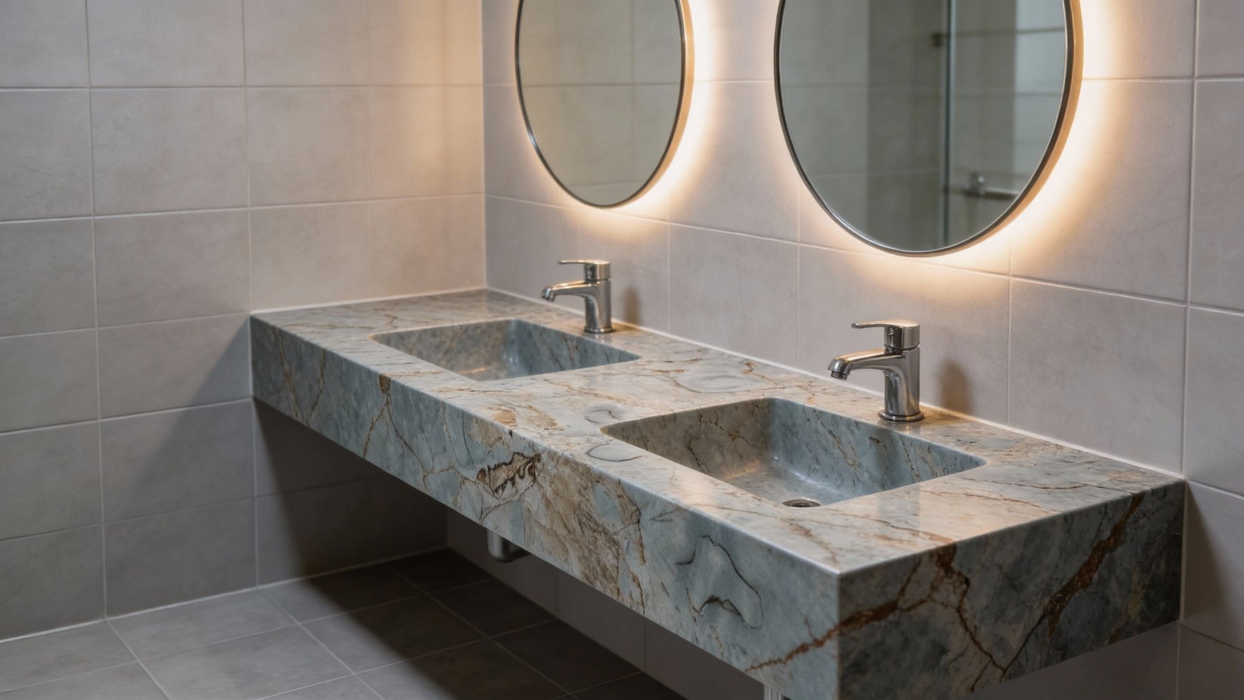 这款石材的底色基调为**柔和的浅灰色系**,间杂着浅米色与淡青色的微妙过渡,整体色调淡雅温润,无强烈对比色,给人宁静舒适、低饱和度的视觉感受,既保留了天然石材的质朴感,又兼具现代空间所需的轻盈感。