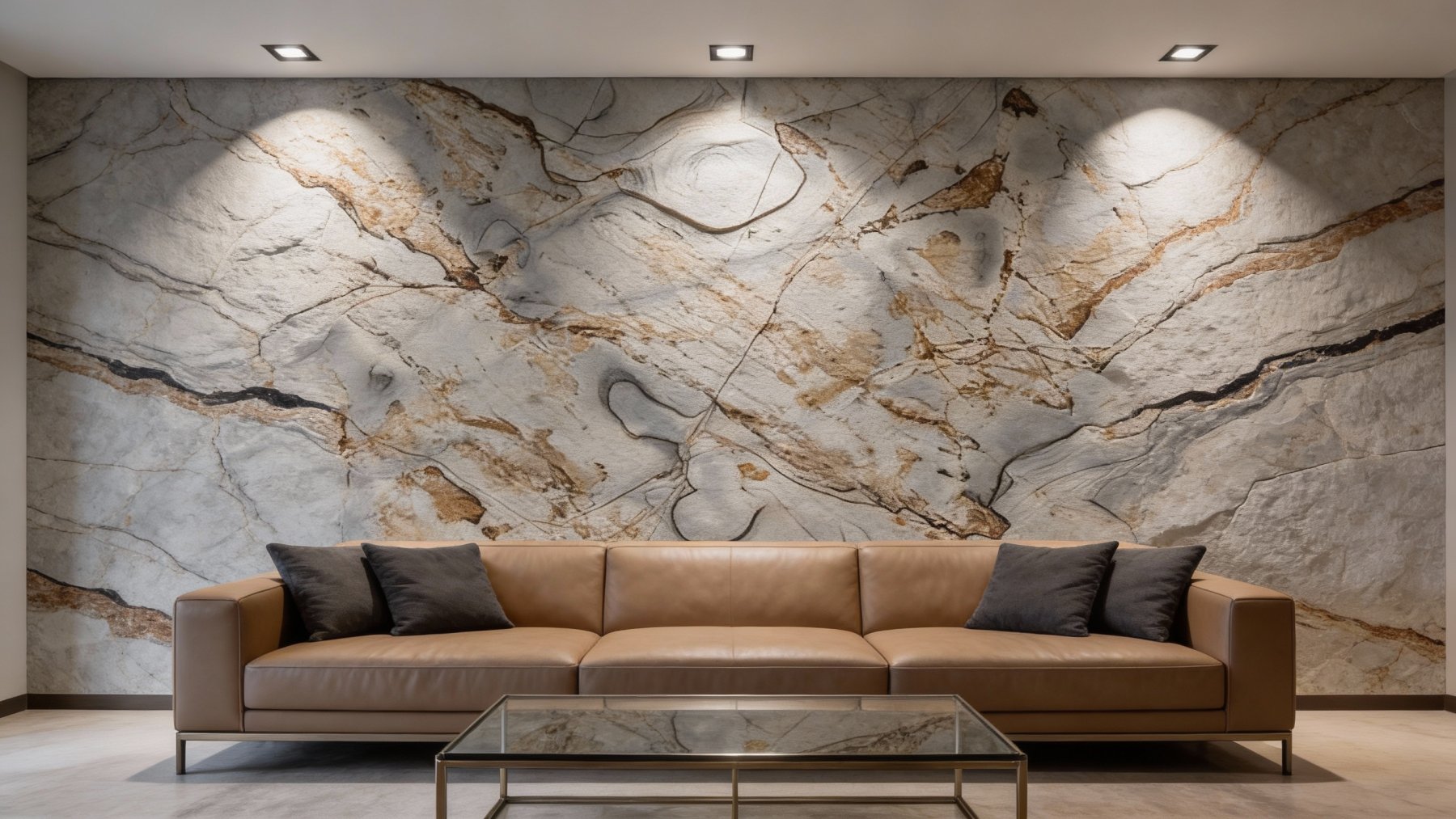 纹理呈现**不规则的自然脉络状与斑块状交织**的形态:深灰色的纤细线条似地质脉络般蜿蜒穿梭,棕褐色的温润斑块如晕染的水墨般错落分布;线条粗细变化有致,斑块边缘过渡柔和,无生硬切割感,整体似天然地质运动留下的流动痕迹,层次丰富且富有动态韵律,避免了单调感。