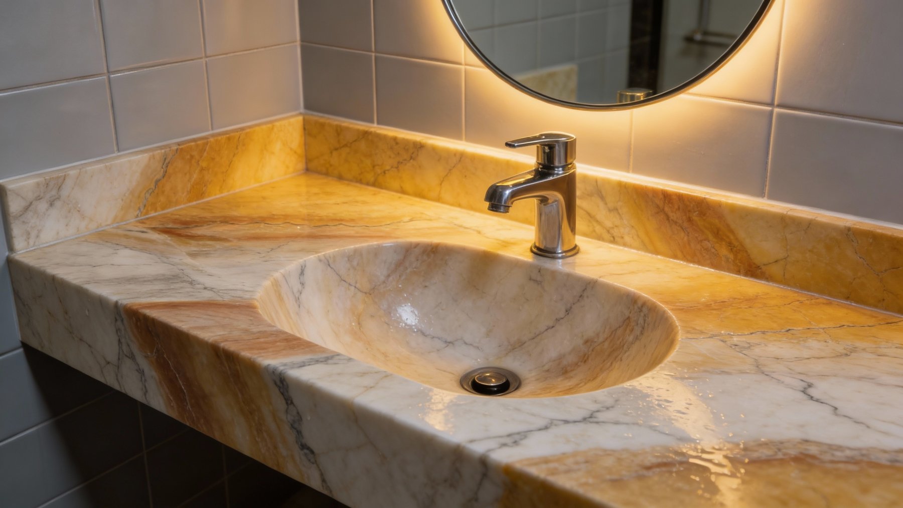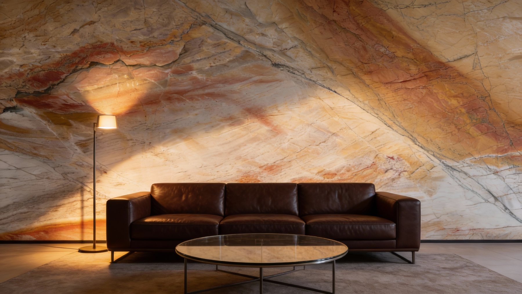 石材底色以柔和暖色系为主,融合浅米白、淡粉橙与暖黄调的自然渐变,整体呈现温暖雅致的氛围。不同区域底色深浅交错,既保持统一的暖感基底,又通过微妙的色彩过渡形成丰富层次,仿佛被阳光轻拂过的地质层,自带治愈的自然温度。