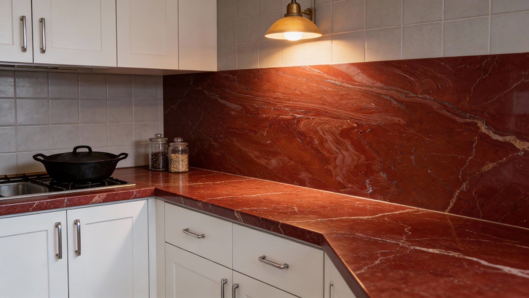 石材表面细腻光滑,带有温润的自然光泽:深色肌理区域光泽内敛醇厚,浅色纹理边缘则折射出柔和的微光,光影层次丰富。局部点缀着纤细的浅白色或银灰色结晶细纹,与主色调形成微妙对比,既打破了单调感,又增添了质感的精致度;触感应是细腻顺滑,兼具石材的坚硬质地与纹理起伏带来的微妙层次触感,视觉与触觉的融合度高。