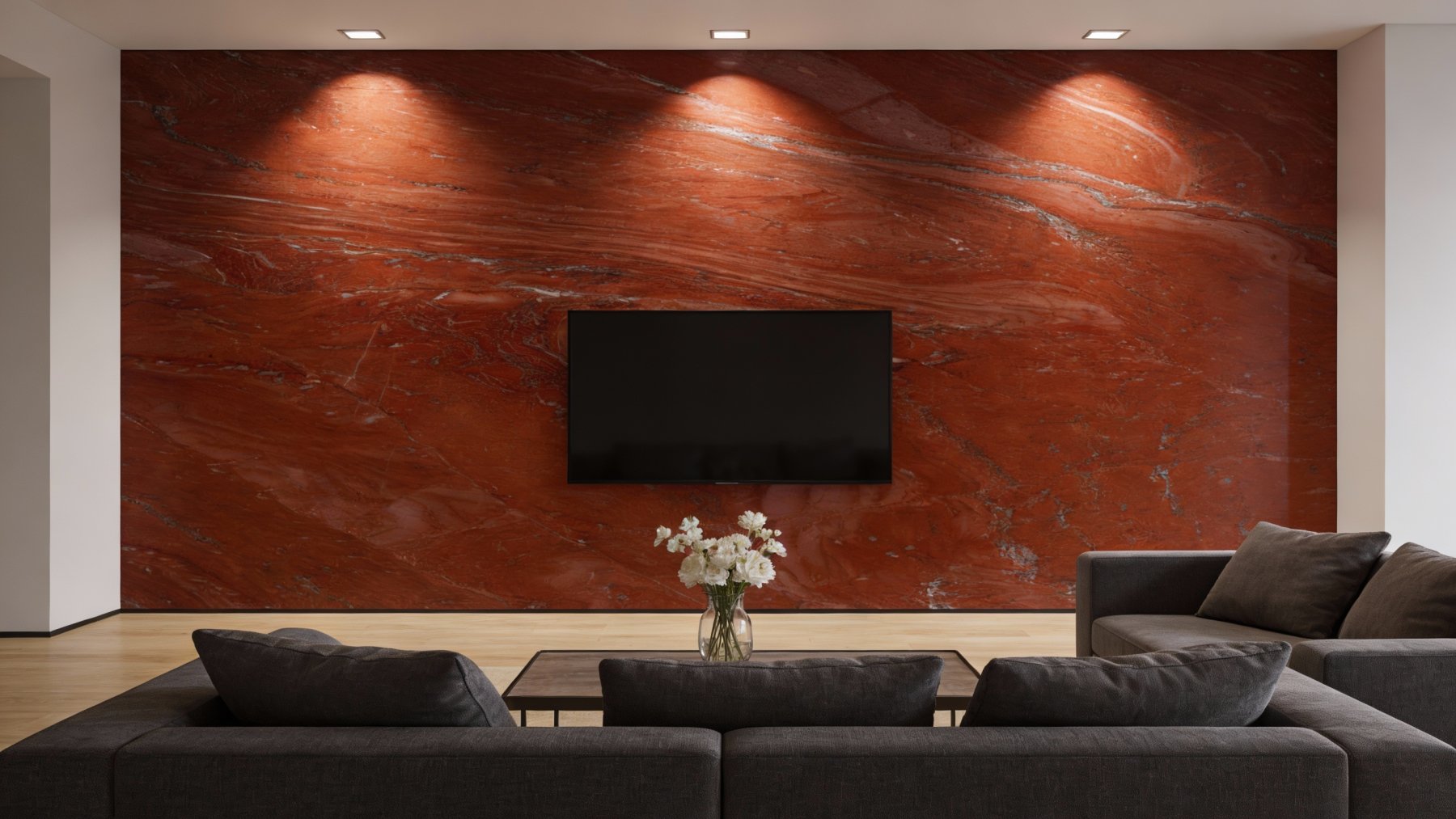 纹理以**自然流动的曲线条**为主要特征,呈层叠交织的带状分布:似山间溪流蜿蜒冲刷的痕迹,又若云雾翻卷舒展的形态。深浅不一的红棕与褐色调纹理相互缠绕,时而密集紧凑(如水流交汇的涡旋),时而疏朗开阔(如平展的波纹),形成富有动态韵律的视觉效果,仿佛记录着地质演变的自然轨迹,无刻意雕琢的匠气。