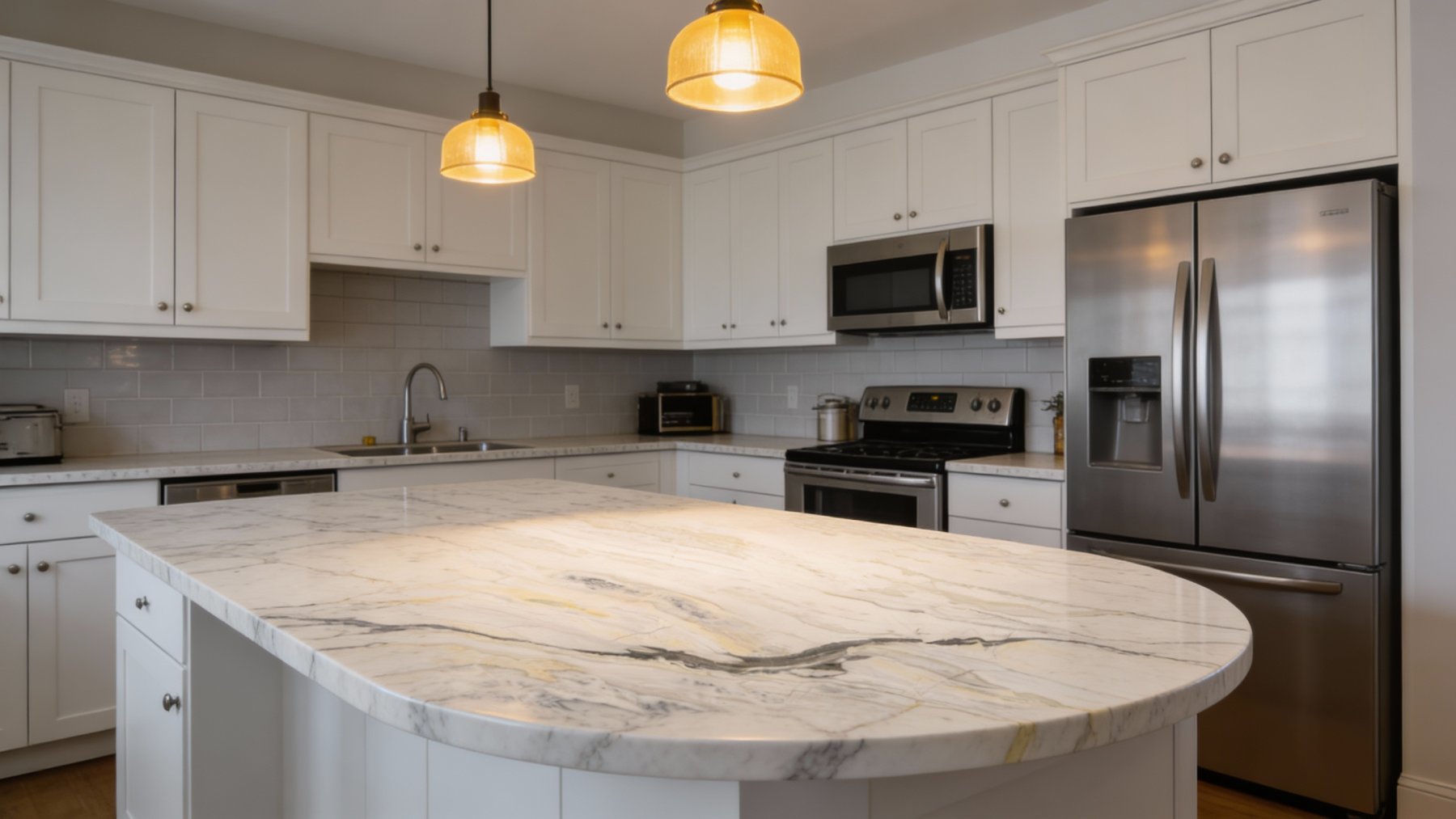 这款石材以纯净雅致的白色为核心基底,其间自然晕染着浅灰与淡米色调的柔和过渡,整体基调清透洁净,既似初雪般纯粹,又因浅淡的暖调融入而不显生冷,反而透着温润柔和的质感,给人简约大气且舒适的视觉印象。