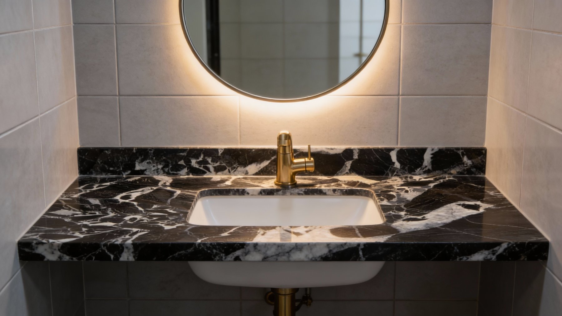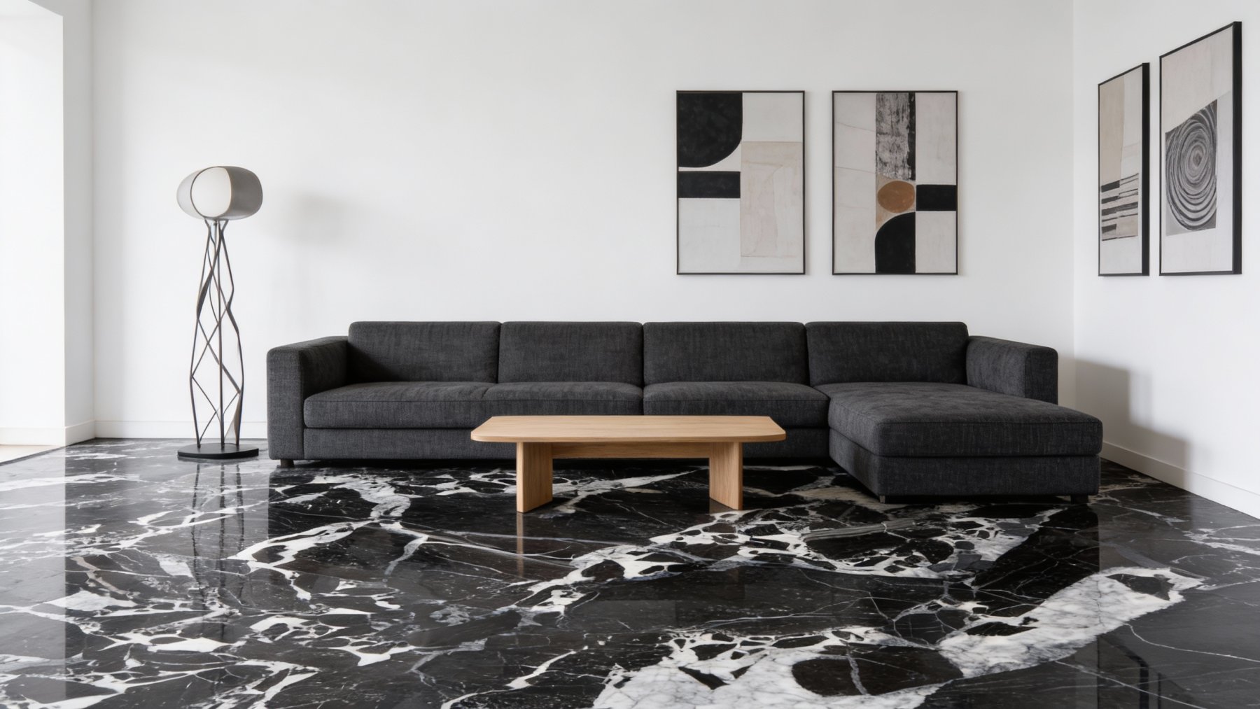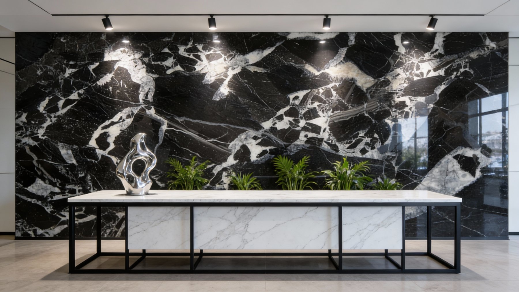 石材表面细腻光滑,带有柔和温润的光泽感,触感应是平滑顺滑;黑色基底部分质地致密均匀,质感厚重坚实,给人稳定可靠的触觉联想;白色纹理则通透感十足,部分区域隐约可见细微的天然肌理变化(如极淡的灰色调过渡),并非单一纯白,增添了自然的层次感。整体既展现出石材的硬朗质感,又因纹理的灵动而透着雅致的艺术气息,兼具实用与装饰的双重价值。