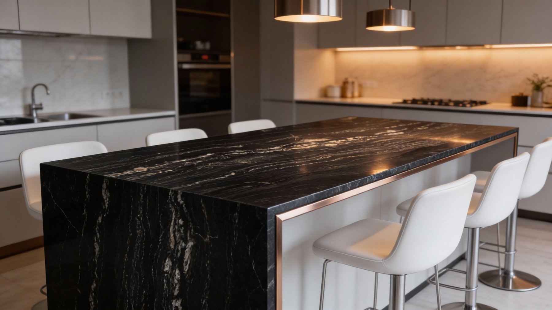 表面质感**细腻致密**,触感应是温润光滑(推测为半哑光或缎面光泽),兼具天然石材的厚重感与柔和光泽度。纹理细节处藏有惊喜:金色纹理中隐约可见细碎的闪光颗粒,增添精致璀璨感;浅色纹理带轻微通透感,与深黑底色形成强烈对比,既保留了天然石材的质朴,又透出高级的精致感,整体质感大气而不失灵动细节。