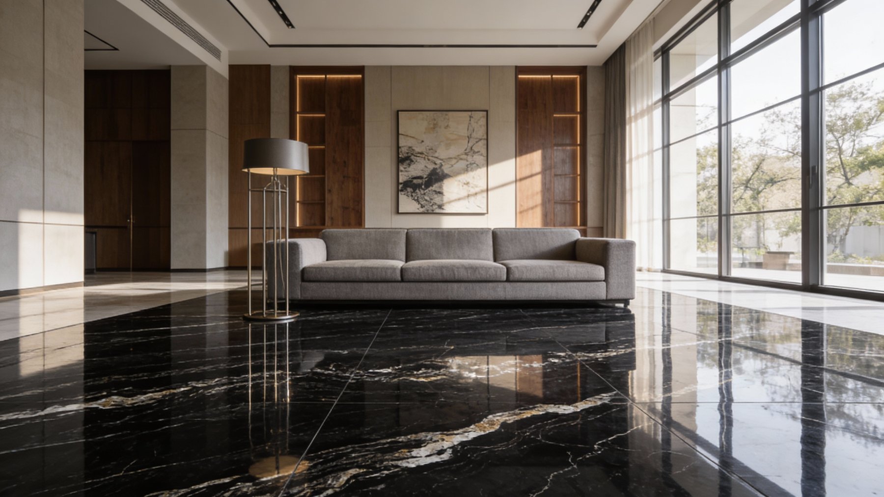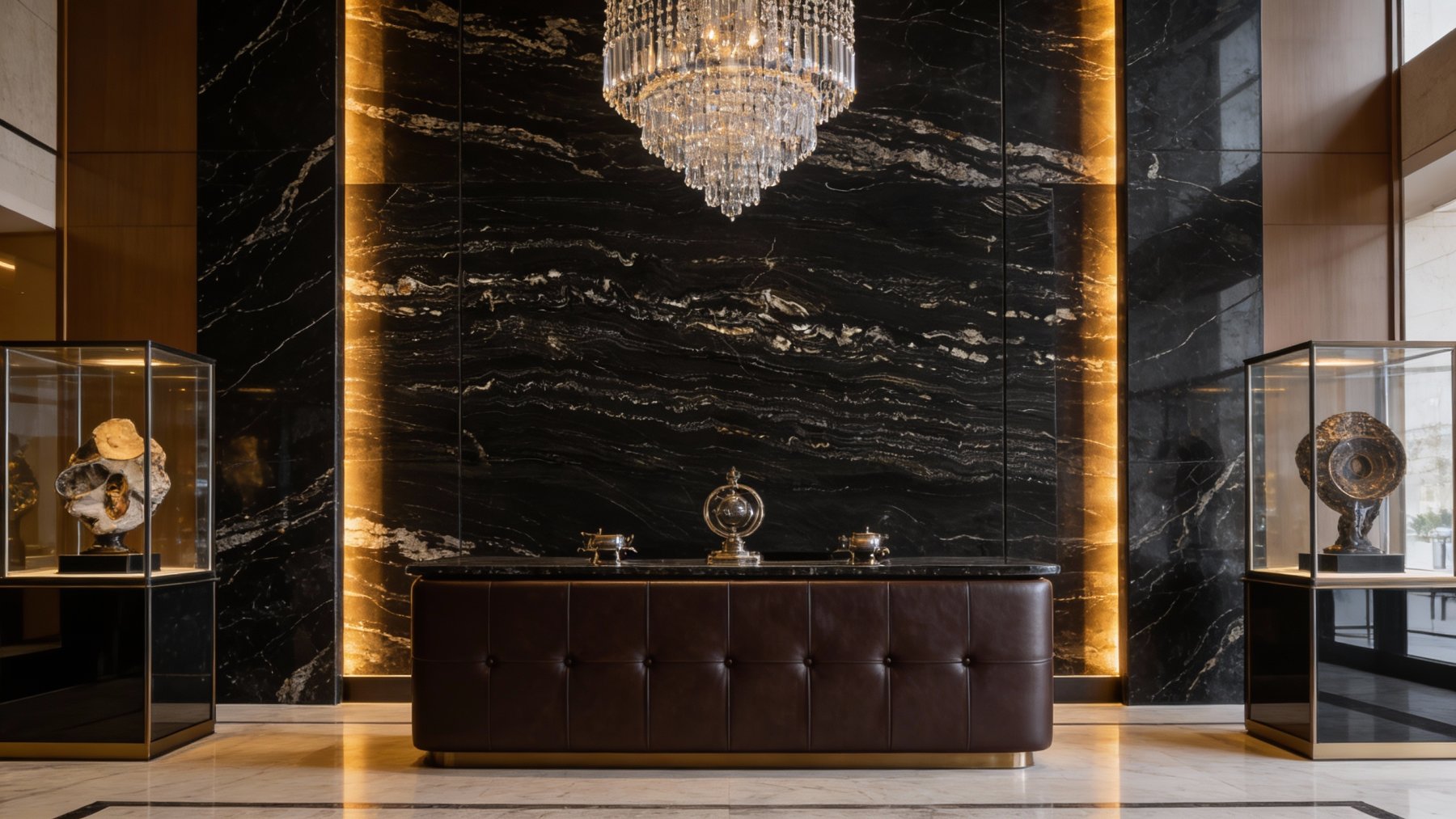 这款石材的底色基调为**浓郁深邃的墨黑色**,色泽饱满厚重,如同沉淀的浓墨般纯粹均匀,无杂色干扰,奠定了沉稳、奢华的视觉基底,能最大化凸显纹理的灵动层次。