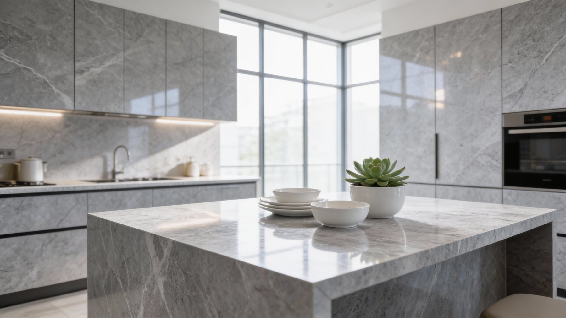 这款石材的底色基调为**多层次冷灰色系**,以柔和的浅灰与沉稳的中灰为核心,局部晕染着炭灰色的深邃斑块,同时点缀近乎灰白的浅调区域,整体呈现出「冷而不僵、灰而有韵」的质感。色调过渡自然无断层,既保留了石材的天然厚重感,又通过深浅变化避免了单调,奠定了低调高级的视觉基底。