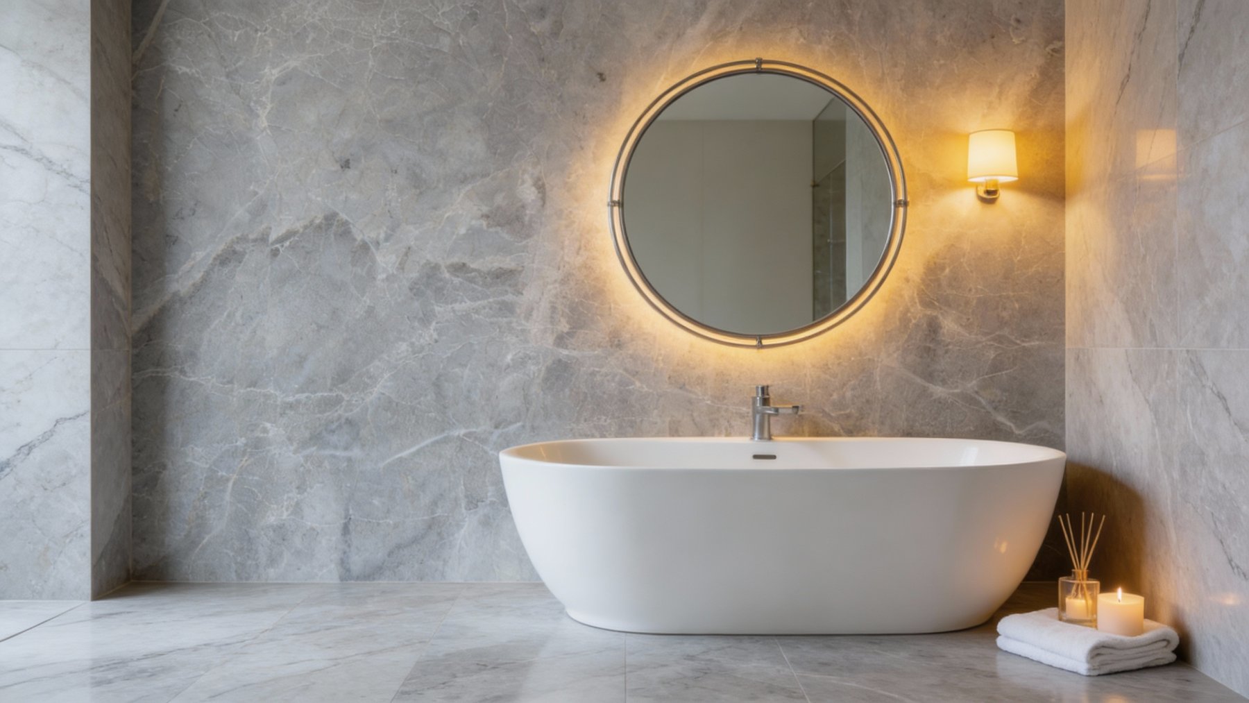 表面质感**细腻温润且富有层次**,触感应是平滑中带着细微的天然肌理起伏,趋近于半哑光的细腻质地(非镜面高光)。细看之下,纹理边缘有自然的渐变晕染,局部散布着微小的深色矿物斑点与浅色结晶颗粒——这些天然细节并非瑕疵,而是赋予石材真实感的关键,让其脱离人工复刻的刻板;整体质感厚重扎实,却因纹理的轻盈感消解了笨重感,兼具石材的坚硬属性与视觉上的柔和度。