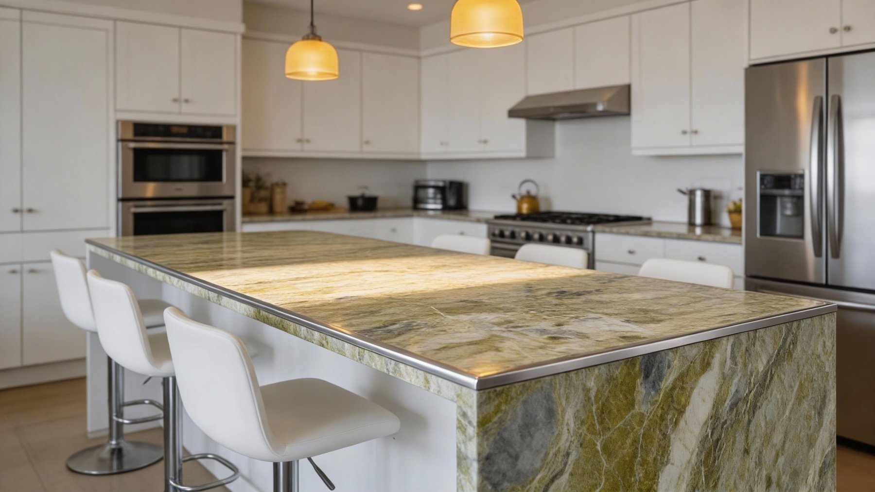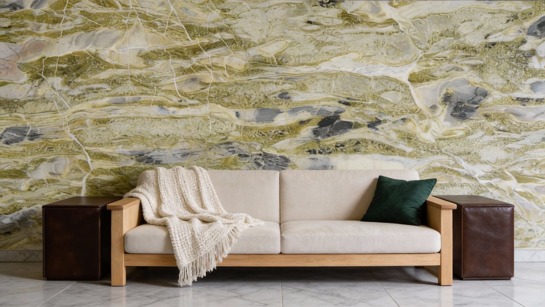 石材表面经抛光处理后**细腻光滑,温润如玉**,触感应是冰凉细腻,光泽柔和不刺眼。纹理间的色彩过渡自然柔和,深灰斑块中隐约可见细微的颗粒质感,为整体增添了天然石材的质朴感;而浅灰、白色的纤细脉络穿插于黄绿纹理中,如自然裂隙般精致,既丰富了细节变化,又提升了质感的层次感,让石材在细腻中不失生动。