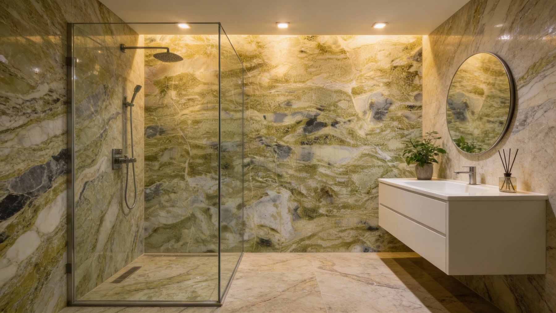 这款石材的底色基调以**柔和的浅米白与淡橄榄绿交织**为主,呈现出自然温润的暖调基底。两种色调并非泾渭分明,而是相互渗透、渐变过渡,既保留了浅米白的清爽感,又因淡橄榄绿的融入增添了自然生机,整体基调雅致宁静,自带舒缓的视觉氛围。
