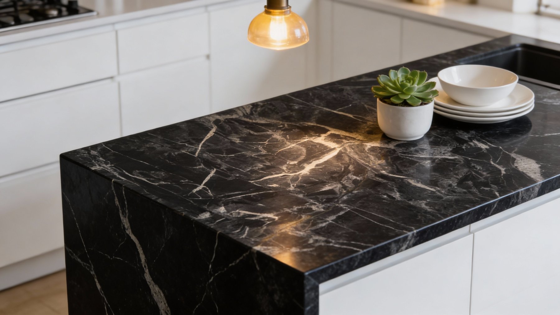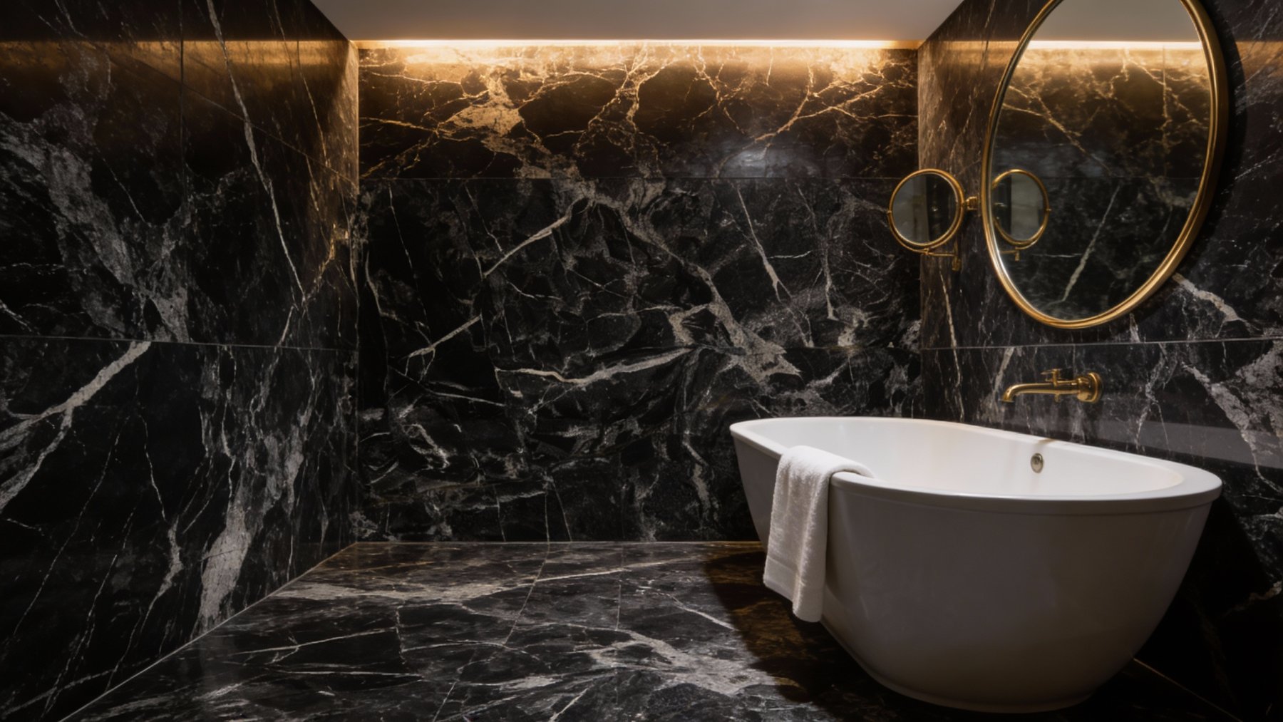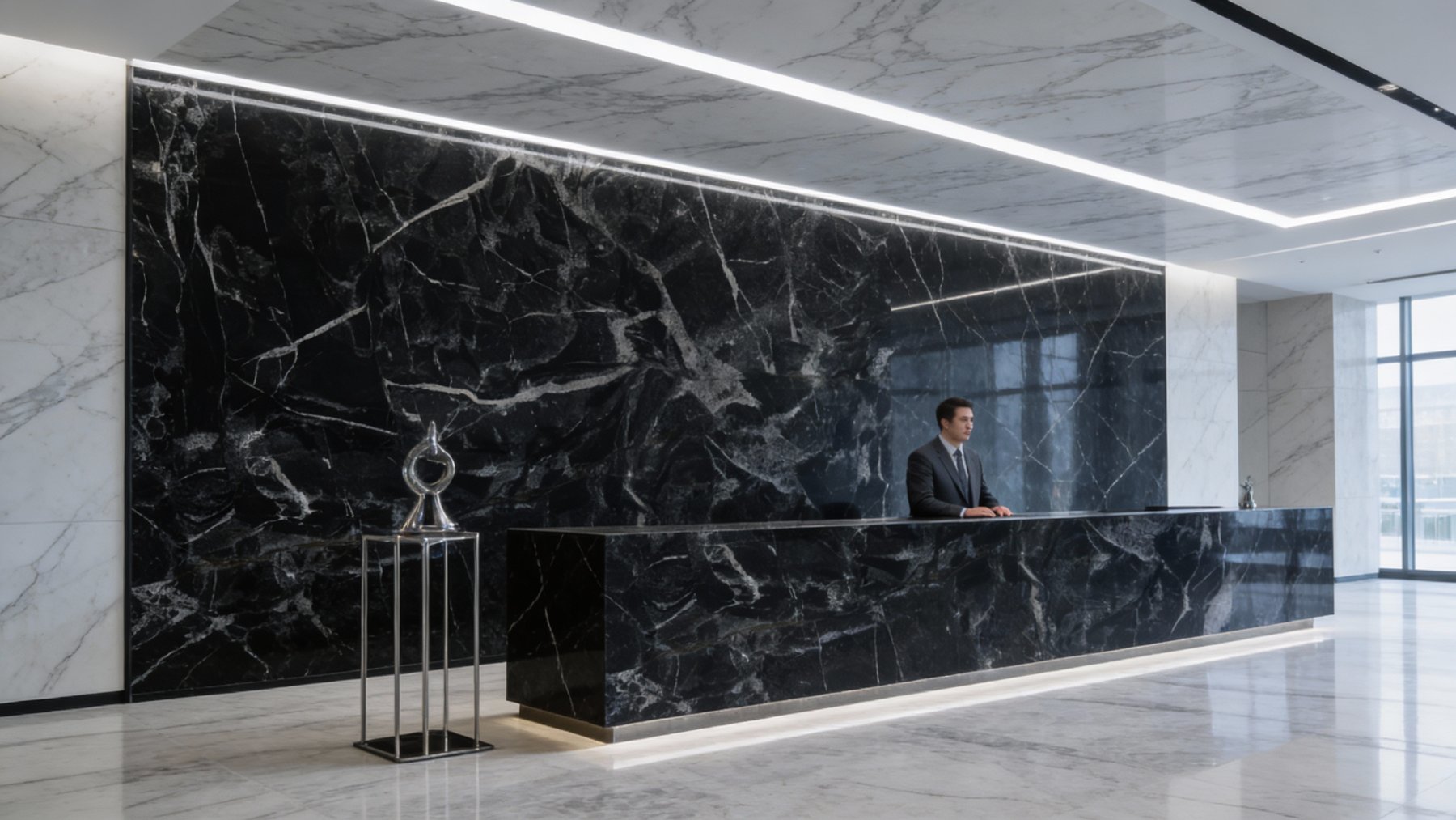 石材表面细腻温润,带有**低调的自然光泽**——墨黑基底部分致密均匀,触感应是平滑紧实;白色纹理处则略带微妙的肌理感,仿佛留存着地质演变的天然印记,视觉上兼具“硬挺的石材硬度”与“柔和的肌理温度”。远观时纹理与底色形成强烈对比,近赏时细节处的质感层次又显精致,整体散发着天然石材独有的厚重与细腻并存的高级质感。