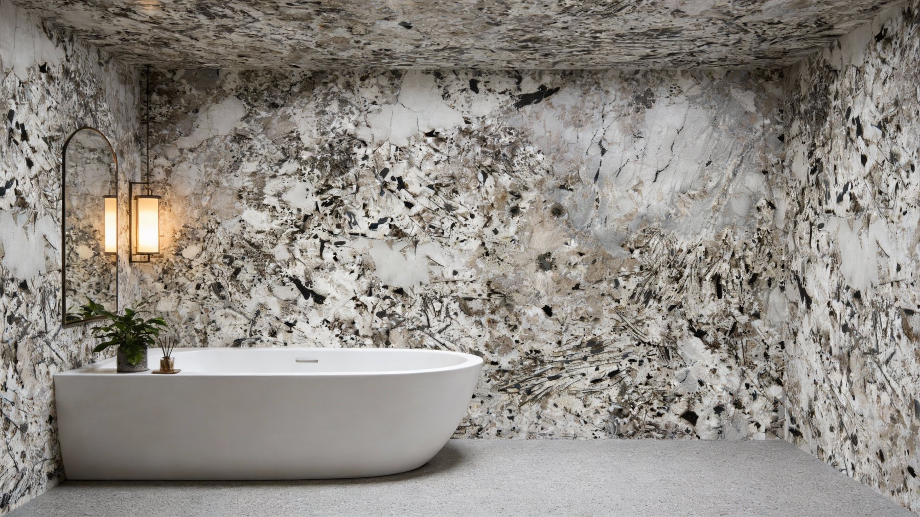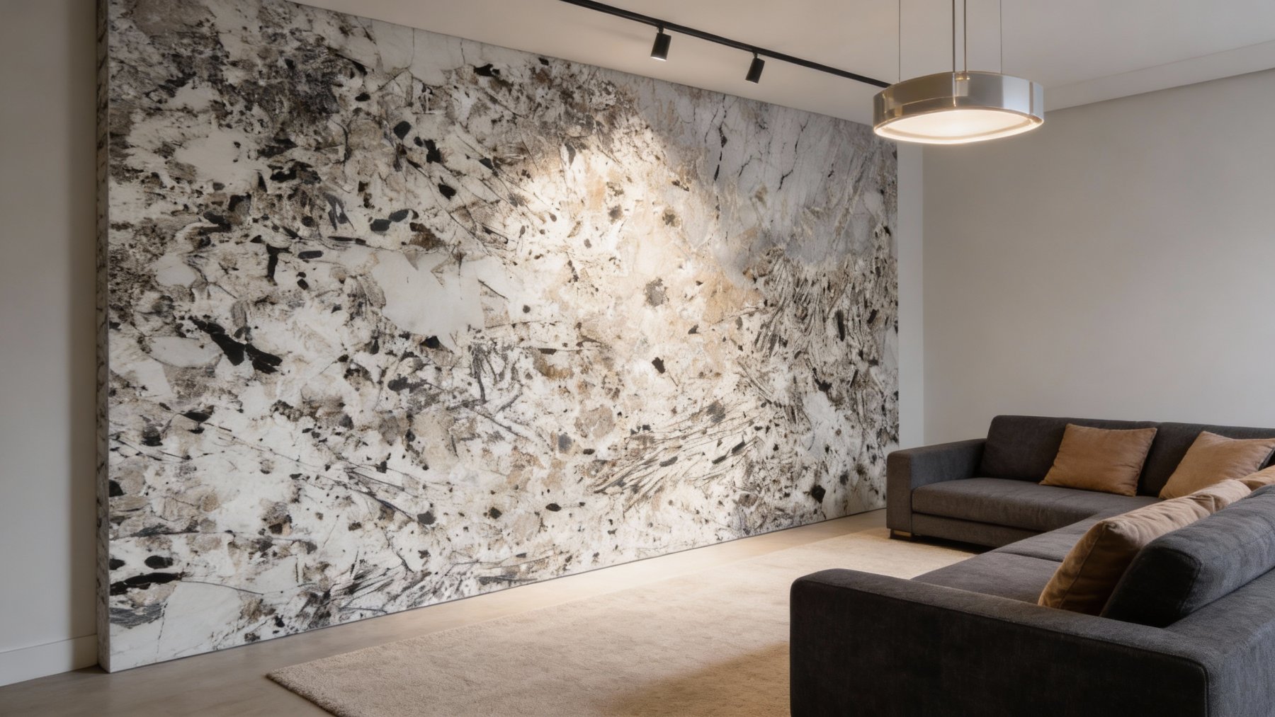 纹理呈现**自然随性的多元交织形态**:深灰、炭黑与浅褐色的矿物肌理错落分布,既有纤细如发丝的线性纹路(似墨笔挥洒的“飞白”线条,纵横交错却不显杂乱),也有大小不一、边缘模糊的斑点状肌理(如星点散落或矿物结晶沉淀,形态不规则却充满韵律)。整体纹理无刻意规律,却动感十足——线性纹理赋予石材“流动感”,斑点肌理增添“颗粒感”,仿佛将地质演变的随机痕迹凝于一石,兼具艺术张力与自然野趣。