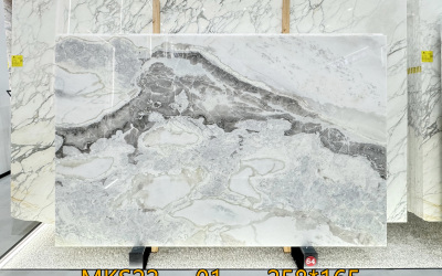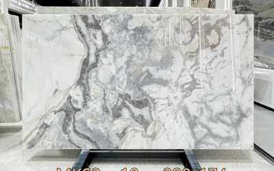 纹理呈**自然流动的水墨晕染质感**,深浅不一的灰色脉络交织蜿蜒:既有大块面的深灰肌理作为视觉焦点,轮廓如山水叠嶂般大气;又有细碎如丝的浅灰线条穿插其间,似云雾缭绕的写意笔触;更有半透明的渐变过渡区域,像水墨在宣纸上晕开的朦胧感。整体形态飘逸灵动,层次丰富且富有韵律,无规则却和谐统一,展现出天然石材独有的随机美感与艺术张力。