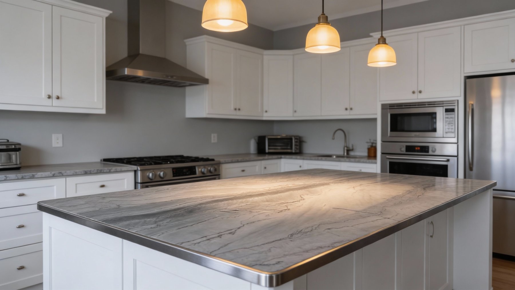 表面经精细处理后呈现细腻光滑的触感,似温润的抛光质地,却又因纹理的层次变化暗藏立体张力:深浅灰调的边界过渡自然,无明显割裂感;裂纹线条纤细清晰,视觉上带有轻微的“刻痕感”,却不破坏整体的平整性。细节处可见灰调中若隐若现的细微肌理,既保留了天然石材的质朴粗糙感(裂隙的野趣),又兼具人工打磨的精致细腻(基底的光滑),质感层次丰富,高级感十足。