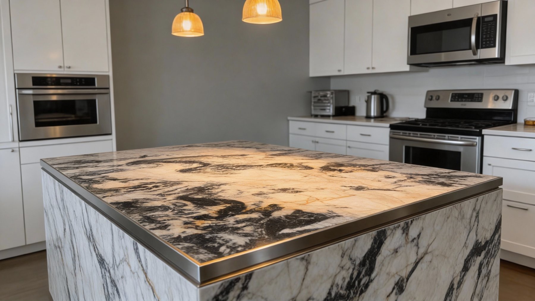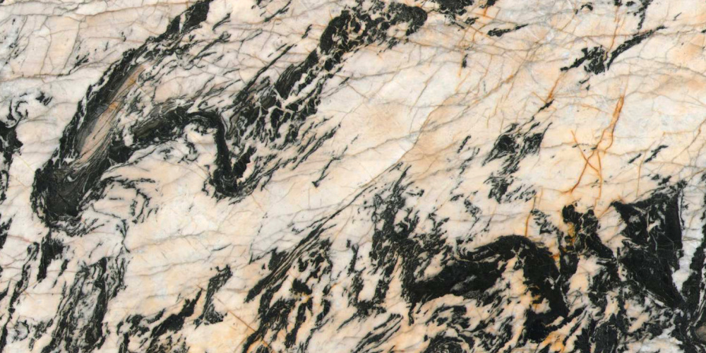 石材表面兼具**温润细腻的天然质感**与**柔和光泽感**:触感应是平滑光洁,底色部分隐现细微的天然肌理(如浅淡的矿物纹理),而非完全平整的工业质感;黑色纹理边缘则兼具清晰锐利与朦胧晕染的双重特质——浓墨处深邃厚重,淡墨处轻盈通透,仿佛墨汁在宣纸上自然晕开的层次,既保留了天然石材的质朴,又透着水墨写意的精致艺术感。